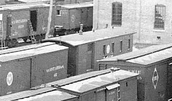And finally, there is this very interesting O&W caboose car. It does not seem to be one of the line’s later home-built snow flanger cars. It appears to be an early O&W work caboose that was converted from an old 28’ boxcar by adding a cupola and some side-windows. There are no open end-platforms, and shadows obscure the end passage-door, if indeed it had any. The question is – when was it made? It is Road Department car R1 in this photo, but was it built by the O&W, or does it date all the way back to the 8000-series “other” cabooses of the Midland? Either way, it shows what a Midland-era boxcar-caboose could have looked like. Note the crew-access steps under the side-door.