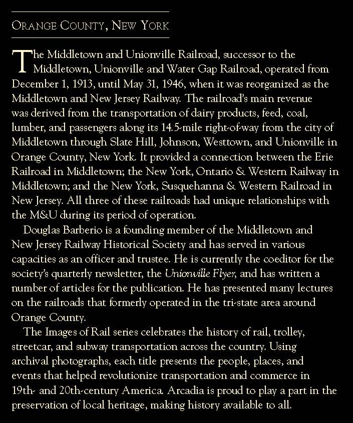 New 2012 Calendar! Experience the O&W through the eyes of Don Furler. Sharing the pages are collectibles, photos and drawings from O&WRHS archives and members Price $10.00 "Center Cabs and Kitchens--Double Cab Locomotives of the NYO&W." Images of Rail MIDDLETOWN AND UNIONVILLE RAILROAD BY Douglas Barberio, Arcadia Publishing 128 page illustrated history of the M&U RR. Eight chapters concentrating on Locomotives, and each station location from Middletown to the NYS&W Hanford Branch. Excellent photographs with detailed captions........................................................................Price $18.00 From the O&WRHS Archives in Middletown New York Various O&W Maps, Structure Plans, Charts, etc. Click Here For Archives Scanning Project Information Click Here For List & Thumbnails Of Available Document Copies (Temporarily Unavailable) THE NYO&W'S MIDDLETOWN BRANCH PART I CORNWALL TO BURNSIDE by Douglas J. Barberio. This in-depth 96 page book covers the southernmost portion of the O&W main line. Included are many track maps and photographs of all the stations along with operational information..................$20.00 The Lost O&W Tapes Volume I - Taped with a reel-to-reel recorder on October 1, 1962 at an O&W "Old Timers" picnic, these recordings of ex-NYO&W employees have sat unlistened to for almost 40 years. Discovered again in the late 1980's when we moved the Cornell collection into our Archives facility they sat for another 13 years before being digitally remastered to compact disc. This first of four volume set begins with Homer House who started with the railroad in1892 and worked for the O&W until the last day of operation in 1957. Total Time: 1:04:23 - Price $9.00 + 3.00 S/H Click here to download jewel case artwork for Disc I The Lost O&W Tapes Volume II - If you enjoyed the first one you'll be equally enlightened by this second cd in a 4 cd series. The interviews continue at the 1962 O&W Old Timers picnic with topics covering many areas of the O&W's operations. Hear firsthand accounts from former O&W employess including Homer House, Art Hodge, Bill O'Neill, Eric Faigle and Cleremont Bonnefort. Total Time: 1:02:35 - Price $9.00 The Lost O&W Tapes Volume III - If you enjoyed the first and second one you'll be equally enlightened by this third cd in a 4 cd series. The interviews continue at the 1962 O&W Old Timers picnic with topics covering many areas of the O&W's operations. Hear firsthand accounts from former O&W employess including Homer House, Art Hodge, Bill O'Neill, Eric Faigle and Cleremont Bonnefort. Total Time: 43:41 - Price $9.00 The Lost O&W Tapes Volume IV - The last and equally informative cd in a 4 cd series. The interviews continue at the 1962 O&W Old Timers picnic with topics covering many areas of the O&W's operations. Hear firsthand accounts from former O&W employess including Homer House, Art Hodge, Bill O'Neill, Eric Faigle and Cleremont Bonnefort, and introducing Leland VaValley. Leland was born 11/8/85 in Franklin Station NY. He was a fireman in Cadosia in 1936 when his Social Security started. Total Time: 58:52 - Price $9.00 OBSERVER ISSUES "Ridin' the Rails - Passenger Equipment of the N.Y.O.& W. Ry." is the OWRHS 2007 Observer. This Observer is 202 pages, of text, photos, car diagrams and a spreadsheet format roster of O&W passenger cars from car No. 1 to No. 546; -- the last item being complete with disposition information as available. Soft Cover.............................................$30 Laminated Hard Cover.............$35 A Ride through the Countryside on the Syracuse & Chenango Valley Railroad is a story about the earliest days of the New York & Oswego Midland Railroad and its difficulties in building a planned route from Earlville to Syracuse. In 1866, the Midland vacated its plans to build the railroad along this corridor and adopted a route to Oswego via Oneida. The Syracuse & Chenango Valley Railroad was born two years later and eventually constructed its line along the route the Midland had earlier desired. Located nearly mid-way between Syracuse and Earlville was a tunnel and a heavy grade that only the Midland could have embraced had its mainline passed this upland countryside as originally planned. Soft Cover.............................................$30 Volume V " A Guide to the New York Ontario and Western Railway's Northern Division " is off the press and is available for purchase. The guide covers the railroad from Sidney to Munns on the main line, as well as the New Berlin Branch and Pecksport Loop. It contains 112 pages with over 78 photographs with maps and drawings to help follow the right of way of the "Old and Weary " . The final volume will cover the balance of the Northern Division from Munns to Oswego and include the Utica Division and Rome Branch. $20.00 THE NYO&W'S MIDDLETOWN BRANCH PART I CORNWALL TO BURNSIDE by Douglas J. Barberio. This in-depth 96 page book covers the southernmost portion of the O&W main line. Included are many track maps and photographs of all the stations along with operational information..........................................................................................................$20.00 Guide for Liberty to Sidney & Delhi Branch of the New York Ontario & Western Railway. The third auto tour guide by Charles Breiner and Willam Scott covering the upper part of the O&W's Southern Division. Station drawings, with maps and many photographs. 134 pages 8 1/2 x 11 on coated paper. Spiral bound.--------------------------------------------$15.00 MEMORIES OF POP AND THE O&W RAILWAY BY CLYDE R. CONROW & TRAIN CONTROL ON THE NYO&W RAILWAY BY ROBERT E. MOHOWSKI .......................................$15.00 GUIDE TO THE NYO&W RAILWAY'S SOUTHERN DIVISION - Cornwall to Liberty by Breiner and Scott. This definitive auto tour guide covers each station in detail with many maps and photos. The first of a new series of guides to the entire NYO&W. 98 pages, softbound, 81/2 x 11", coated paper, spiral 