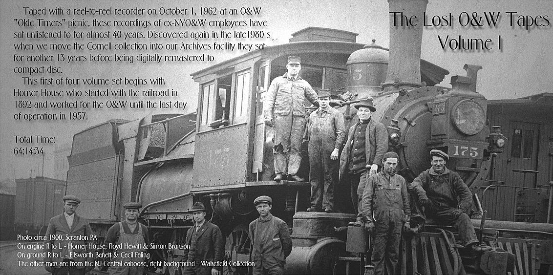 The Lost O&W Tapes Volume I - Taped with a reel-to-reel recorder on October 1, 1962 at an O&W "Old Timers" picnic, these recordings of ex-NYO&W employees have sat unlistened to for almost 40 years. Discovered again in the late 1980's when we moved the Cornell collection into our Archives facility they sat for another 13 years before being digitally remastered to compact disc. This first of four volume set begins with Homer House who started with the railroad in1892 and worked for the O&W until the last day of operation in 1957. Total Time: 1:04:23 - Price $9.00 + 3.00 S/H Click here to download jewel case artwork for Disc I