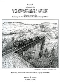 Travel the O&W in your car! These guidebooks, published for the Society's bus excursions, will route you over the roads near the O&W and lead you to the remaining stations, bridges, tunnels, etc. Illustrated with photos, maps, diagrams, etc. A Guide to the New York Ontario and Western Railway's Northern Division - Volume V covers the railroad from Sidney to Munns on the main line, as well as the New Berlin Branch and Pecksport Loop. It contains 112 pages with over 78 photographs with maps and drawings to help follow the right of way of the "Old and Weary " . The final volume will cover the balance of the Northern Division from Munns to Oswego and include the Utica Division and Rome Branch. $20.00 A Guide to the NYO&W Railway's Southern Division - Cornwall to Liberty by Breiner and Scott. This definitive auto tour guide covers each station in detail with many maps and photos. The first of a new series of guides to the entire NYO&W. 98 pages, softbound, 81/2 x 11", coated paper, spiral bound. .......................................$ 15.00